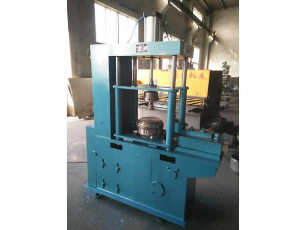 鋼瓶封頭縮口機采用封頭自轉,氣動定位夾緊,縮口滾刀擠壓成型,控制凸輪旋轉一周,成型一只封頭。調整滾刀拖板的行程,可改變縮口直徑大小。該機與輸送線聯動,可實行自動化操作。